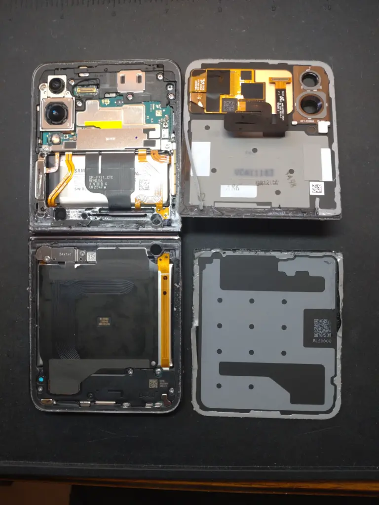 折りたたみスマートフォンは通常のスマホよりも複雑な構造。慎重にバックパネルを開封し、内部の折りたたみ機構やフレックスケーブルを傷つけないよう注意しながら分解を進めます。デュアルバッテリー構造のため、2つのバッテリーを確認。