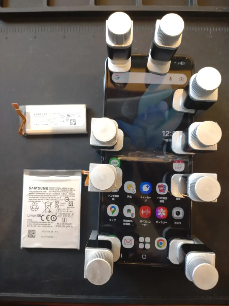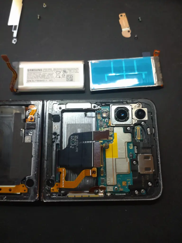 劣化したSamsung純正バッテリー(上下2つ)を慎重に取り外し。折りたたみ部分のフレックスケーブルに接触しないよう細心の注意を払いながら、新品の純正相当バッテリーに交換します。