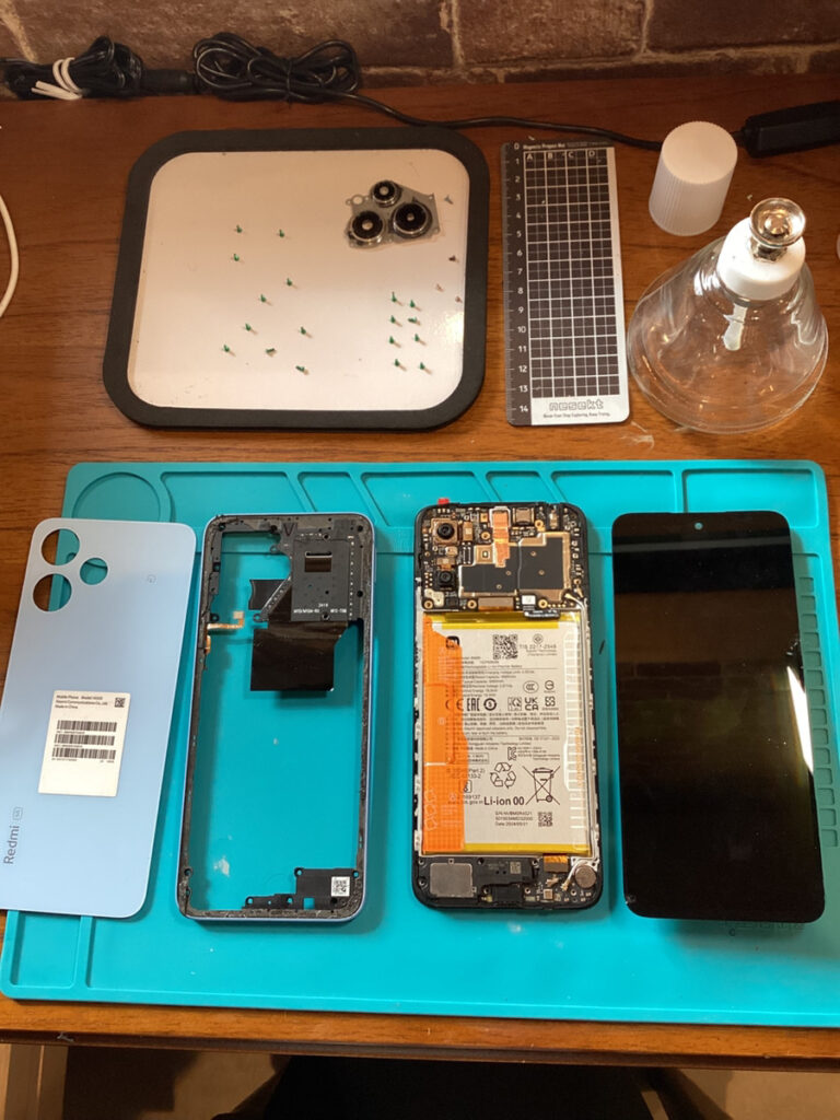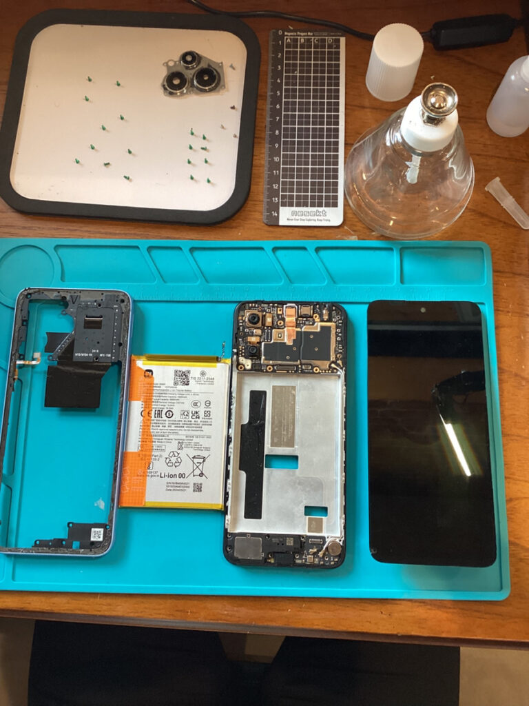 Redmi 12 5Gは分解箇所が多いため、順序とネジ管理を徹底し時短。