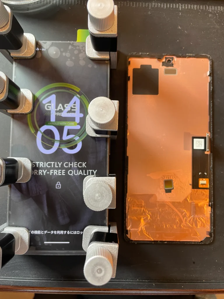 診断後、ヒートガンで粘着を緩め、パネルを慎重に開封。Pixel 7 Proはベゼルが極めて狭いため、内部の指紋センサーを傷つけないようミリ単位の精密さでパネルを分離させます。